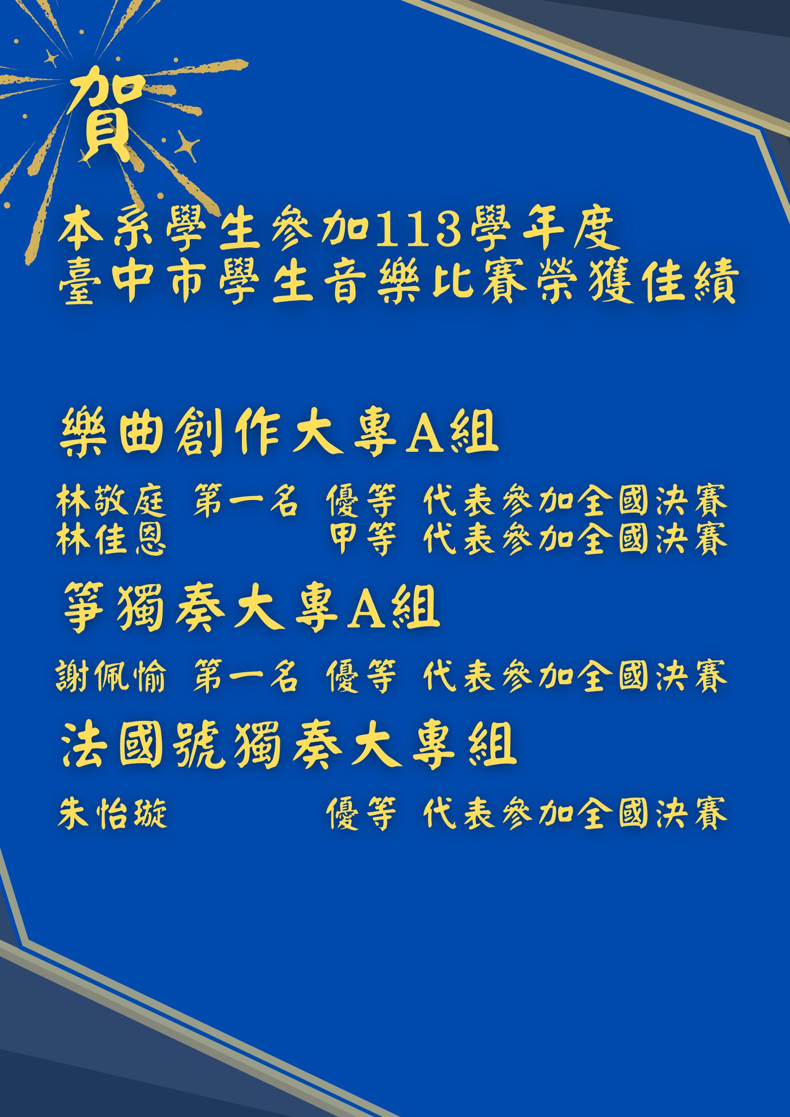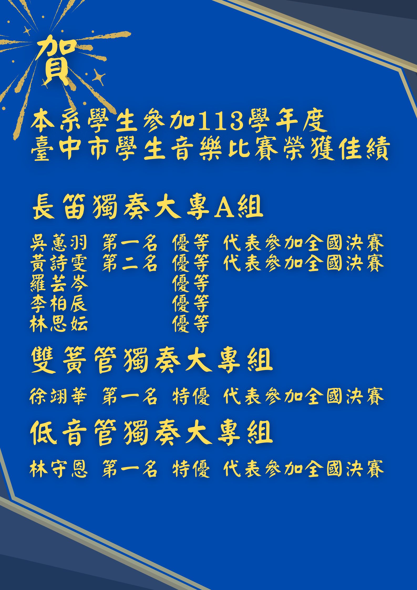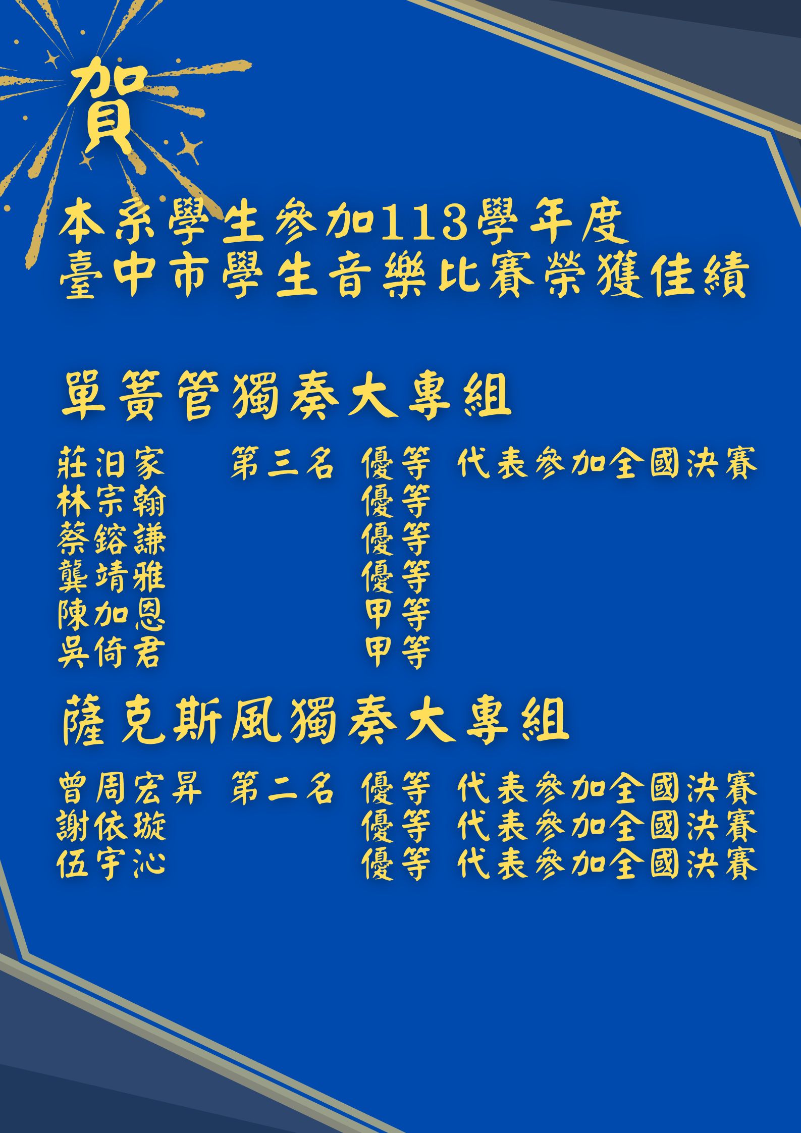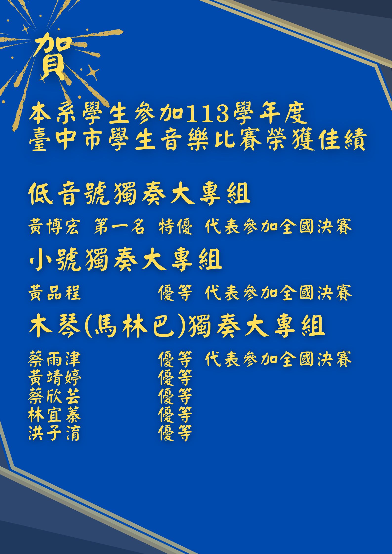 賀 本系學生代表參加113學年度臺中市學生音樂比賽榮獲佳績